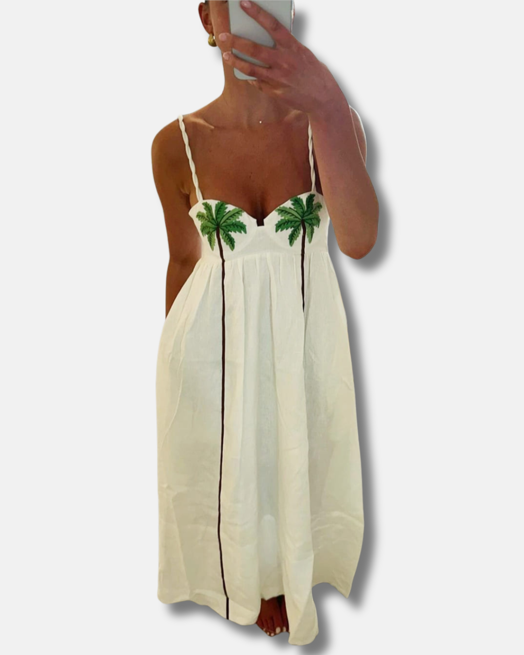 Dale un nuevo aire a tu armario con nuestro vestido "Palma". Este bonito vestido está diseñado con un patrón de palmeras sobre fondo blanco, que combina a la perfección la frescura del verano con la sencillez de lo cotidiano.