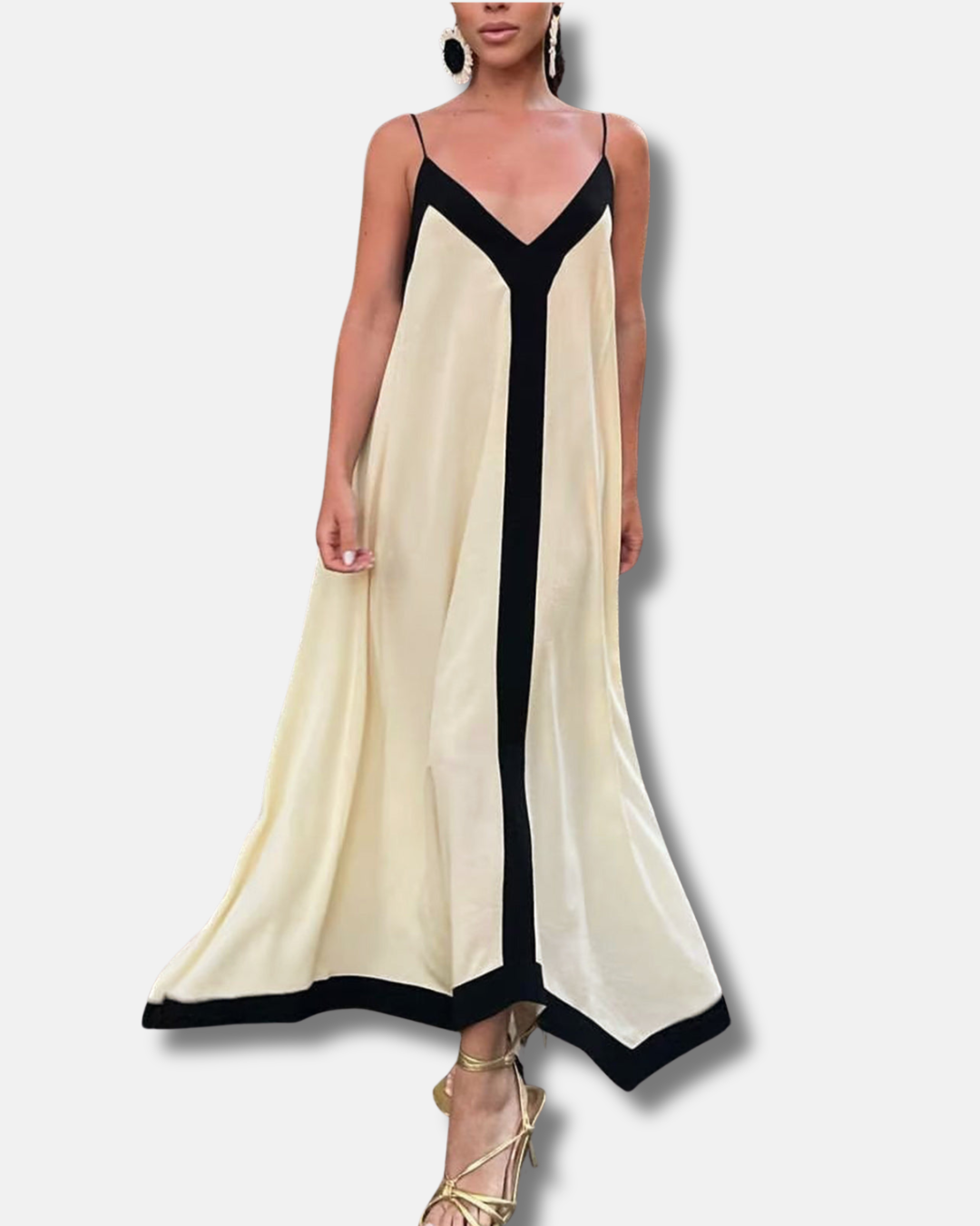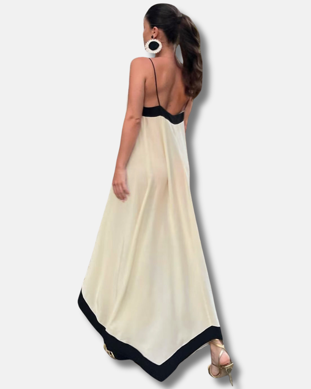 Os presentamos nuestro vestido midi de tirantes "Tarifa", el más vendido la temporada pasada. Su diseño con escote en V, bajo asimétrico en picos, y los detalles de borde bicolor lo convierten en la opción ideal para esas ocasiones en las que quieres ir cómoda sin perder ese toque de estilo y elegancia.